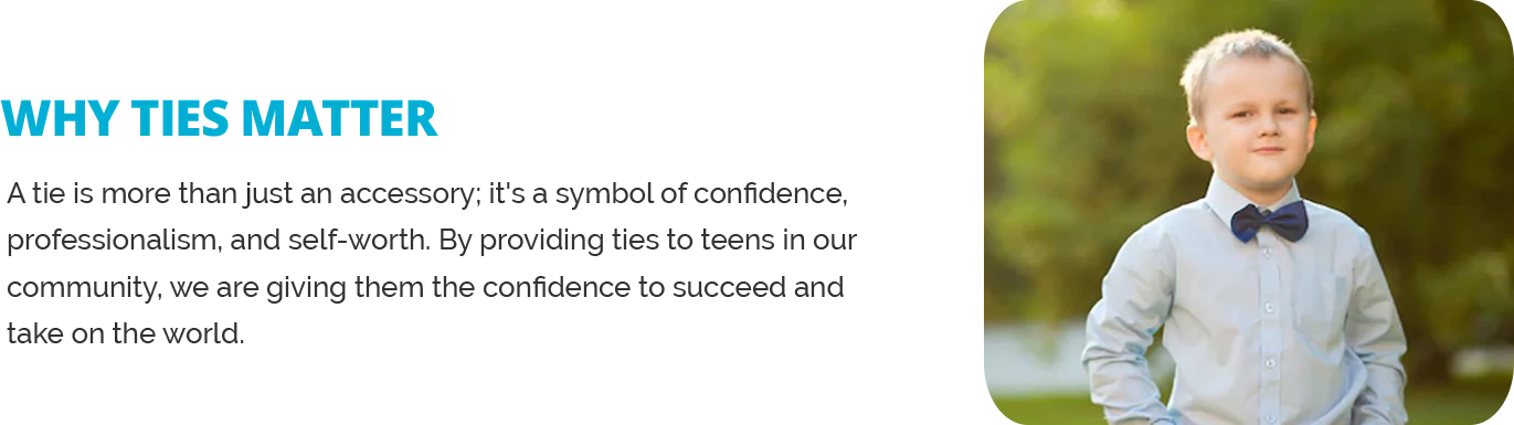 A tie is more than just an accessory; it’s a symbol of confidence, professionalism, and self-worth. By providing ties to teens in our community, we are giving them the confidence to succeed and take on the world.